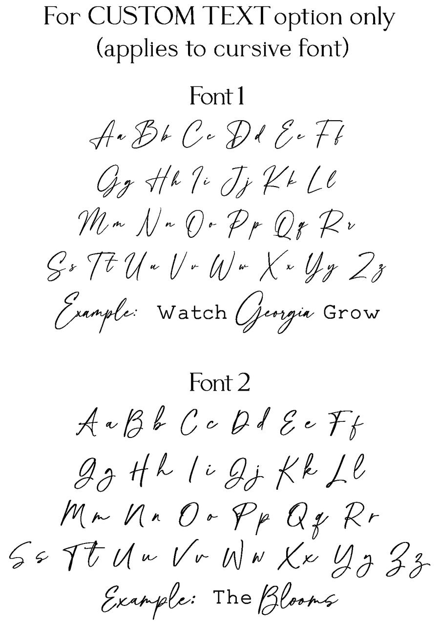 Choose from "Loved Beyond Measure", "Watch Us Grow", or personalise your height chart with your family name, your child's name, or a special custom phrase. Please note "Loved Beyond Measure" and "Watch Us Grow" do not have the choice of font and come standard with Font 3. Custom font choice comes with the "Custom Text" height chart.